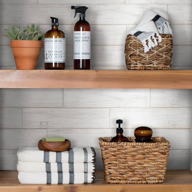 The shiplap design has an aged appearance with subtle distressing for a tres chic reclaimed effect.
