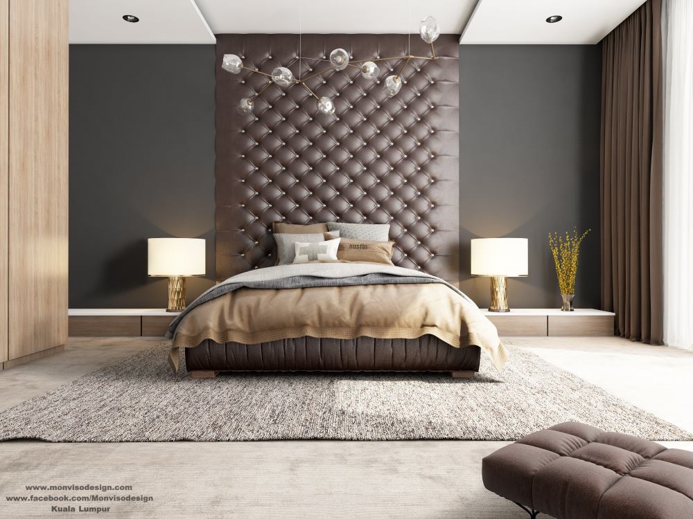 A black leather wingback tufted headboard and a dark stained nightstand add drama to the neutral bedroom. The camden headboard is high quality, soft leather, and was easy to assemble. The following prices are for dark brown leather.