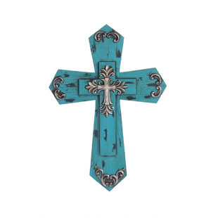 Wooden metal wall cross vintage classical faux turquoise bead iron fleur de lis.