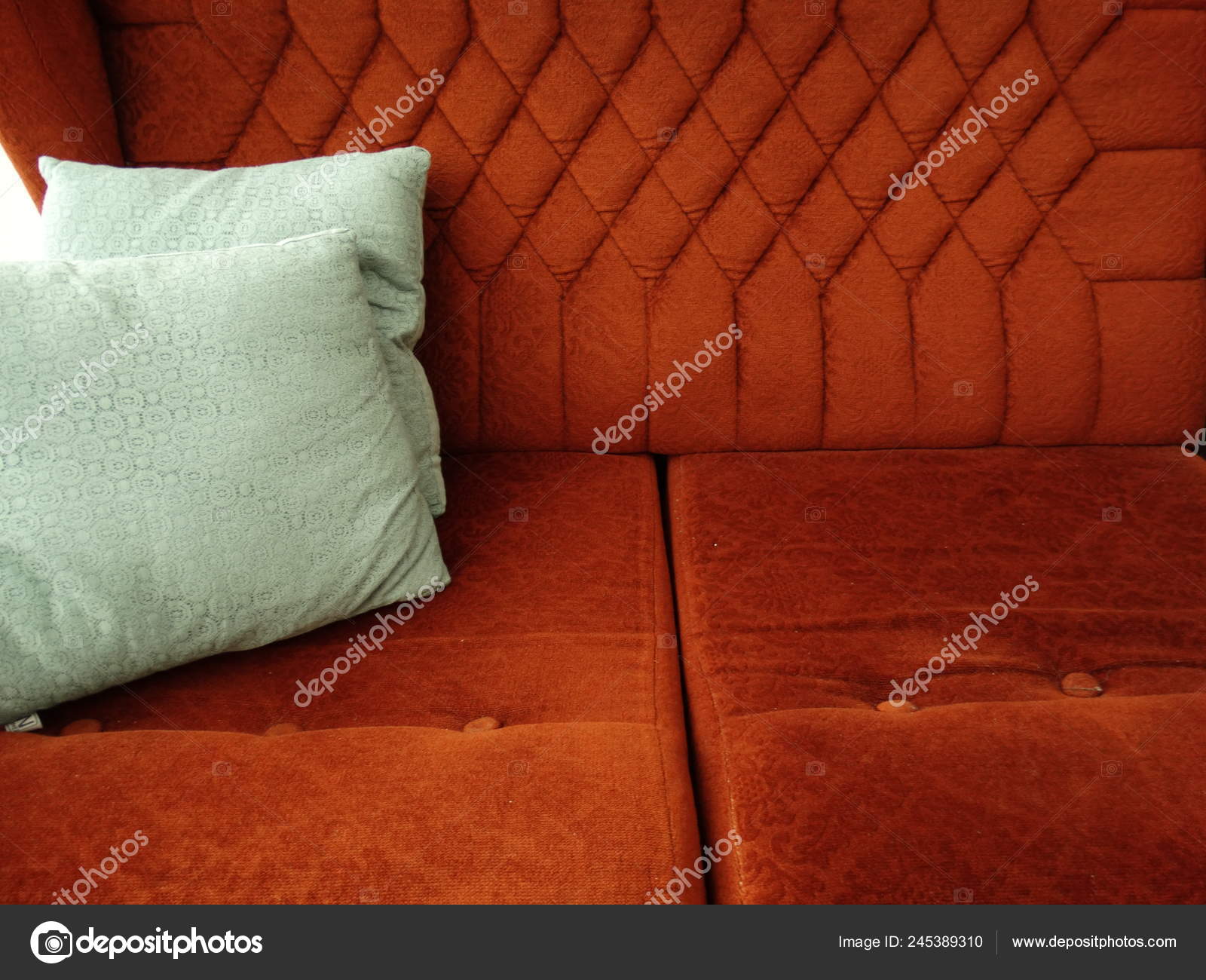 Velvet Grey And Black Pillows On Comfortable Brown Couch In Elegant Living Room With White And Red Wall Stock Photo Download Image Now Istock from media.istockphoto.com