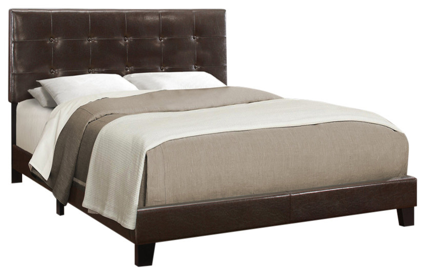 Sophia King Bed W Tall Button Tufted Headboard In Brown Faux Leather Fabric from s.yimg.com